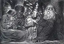 William Blake's Illustrations of the Book of Job primarily refers to a series of twenty-two engraved prints (published 1826) by Blake illustrating the biblical Book of Job. It also refers to two earlier sets of watercolours by Blake on the same subject (1806 and 1821). The engraved Illustrations are considered to be Blake's greatest masterpieces in the medium of engraving,[1][2] and were also a rare commercial and critical success for Blake.
