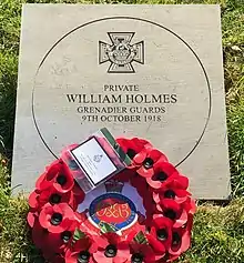 Holmes is buried at Carnieres Communal Cemetery Extension,[6] a cemetery administered by the Commonwealth War Graves Commission, in Carnieres, to the east of Cambrai.[7]