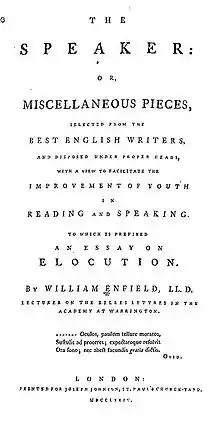 His most successful work, however, was The Speaker (1774), an anthology of literary extracts intended to teach elocution, and produced first for his Warrington pupils.[3] He published a sequel, Exercises in Elocution in 1780. Enfield's Speaker remained in print until the middle of the nineteenth century and inspired other anthologies, such as Mary Wollstonecraft's The Female Reader (1789).