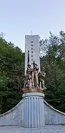 Dean was memorialized in several ways for his actions. The T-34 tank Dean knocked out remained where it was destroyed in Taejon until 1977 as a memorial to the fight.[1] When the city of Daejeon built a Battle of Taejon memorial in 1981 they decided to include a statue that depicted Dean when he was firing his bazooka at North Korean tanks.[85] In his hometown of Carlyle, a newly renovated bridge was named the General Dean Suspension Bridge in 1953. It was inducted into the National Register of Historic Places in 1973.[86] After Dean's death, his uniform and personal items were donated to the University of California at Berkeley ROTC program. The ROTC created a memorial for Dean in the Hearst Gym on campus, designating Room 155 "The Dean Room." Dean's uniform and medals, including his Medal of Honor, have been housed there.[79] The university's Cal Alumni Association also selected Dean as their 1953 "Alumnus of the Year."[87]