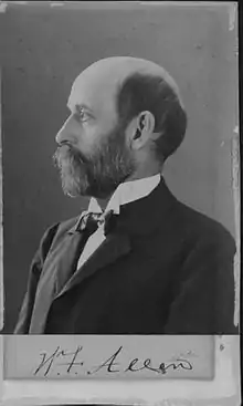 William Fessenden Allen was born December 19, 1831, in Bangor, Maine.[1] His mother was Sarah Elizabeth Fessenden. His father was politician and diplomat Elisha Hunt Allen (1804–1883). After his mother died in 1845, he was brought up by his mother's mother Patty Fessenden in Brattleboro, Vermont, along with his brother and his two sisters.[2]