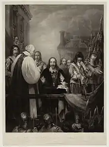 About 1840 Fisk started a series of pictures connected with the reign of Charles I, namely, Cromwell's Family interceding for the life of Charles I (Royal Academy, 1840); The Trial of the Earl of Strafford (never exhibited, engraved by James Scott in 1841, and acquired for the Walker Art Gallery, Liverpool); The Trial of Charles I in Westminster Hall (Royal Academy, 1842); Charles I passing through the banqueting-house, Whitehall, to the Scaffold (Royal Academy, 1843); The last interview of Charles I with his Children (British Institution, 1844). He was also a frequent contributor to the Suffolk Street exhibition.[1]