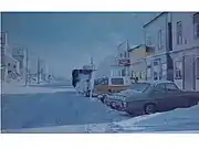 2011 image taken from same view point as 40 Below Zero. The former building block was levelled and is now Bennet Park. A town sign located there incorporates the painting in its design.