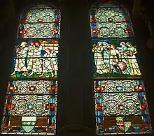 Saunders established a long partnership with the architect William Burges, working with him on many of his major commissions, including Saint Fin Barre's Cathedral, Cardiff Castle, Castell Coch and Burges's Yorkshire churches. David Lawrence and Ann Wilson consider Burges was particularly indebted to Saunders: "his technique [gave] Burges's glass its most distinctive characteristic, namely the flesh colour. This is unique, had no precedents and has had no imitators."[3] Lawrence and Wilson's history of St Fin Barre's has detailed commentaries on the glass there, of which Lawrence writes, "The impact created by all these glowing, coloured religious images is overwhelming and intoxicating. To enter St Fin Barre's Cathedral is an experience unparalleled in Ireland and rarely matched anywhere."[4]