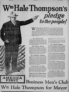 Thompson pledged that his "America First" slate would see such strong victories that, "the king of England will find out for the first time he is damned unpopular".[31] Thompson's campaign anthem was titled "America First, Last and Always". Thompson promised to lend support to the creation of so-called "America First Associations" across the United States.[72] Jeff Nichols of the Chicago Reader would retrospectively observe in 2017 of Thompson's "America First" movement that,