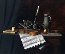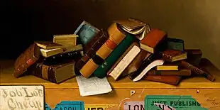 The style of trompe-l'œil painting that Harnett developed was distinctive and inspired many imitators,[1] but it was not without precedent. A number of 17th-century Dutch painters, Pieter Claesz for instance, had specialized in tabletop still life of astonishing verisimilitude. Raphaelle Peale, working in Philadelphia in the early 19th century, pioneered the form in America.[4] What sets Harnett's work apart, besides his enormous skill, is his interest in depicting objects not usually made the subject of a painting.[5] Harnett painted musical instruments, hanging game, and tankards, but also painted the unconventional Golden Horseshoe (1886), a single rusted horseshoe shown nailed to a board.[6] He painted a casual jumble of second-hand books set on top of a crate, Job Lot, Cheap (1878), as well as firearms and paper currency.