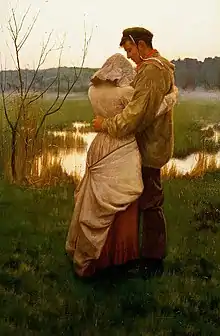 Many of W.H. Gore’s rural paintings display a nostalgic view of the nearby Kennet Valley and the surrounding Berkshire countryside. The influence of the French Barbizon School of realism and in particular the work of Jean-François Millet and François-Louis Français is evident in his work. The heyday of the Barbizon School was over by c 1870 but Gore incorporates some of the prominent features of the French school in the use of: colour, softness of form and in tonal qualities.[6] Two works by Millet The Angelus a painting of two figures standing during a contemplative moment and The Gleaners the latter portraying the figures toiling in the landscape were well known to late Victorians and their symbolic content influenced Gore in his depiction of rural life.[7] Paintings from the 1880s such as: Listed from the Guildhall collection in London and a watercolour In The Gloaming are intimate portrayals of Late Victorian romantic painting. Listed (sic) depicts two young lovers in sad reflection of the prospect of a young man joining up with his regiment. The ribbons in his cap refer to the custom of new recruits wearing their regimental colours to denote their willingness to be shot at for sixpence a day.[8] The pathos of the idea expressed moved H. Stacy Marks, R.A., who was a member of the Council of the Royal Academy, to tears such was its effect on his sensibilities. Marks reaction provides an insight into the mind-set of many Victorians.[9] In The Gloaming sees two lovers by the River Kennet in tender proximity to each other. These were themes that Gore returned to throughout his painting career.