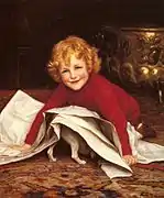 Gore was a Victorian genre painter of children and animals. Genre painting is a term that refers to the depiction of everyday life and was immensely popular in the late Victorian period. Gore’s painting of children and animals capture the excitement and playfulness of a Victorian child at play. They are affectionate and arresting but came to be seen by some critics as trite and sentimental.[12][2] Their reassessment took the best part of a century. The whereabouts of many of his genre paintings are unknown with some examples known only from photographs and sketches discovered at his studio in Newbury.[2] One of W.H.Gore’s most famous images is Forgive Us Our Trespasses exhibited at the Royal Academy in 1897. A little girl in a night-dress is kneeling against her bed saying her prayers. A small dog, possibly one of the terriers that Gore owned, is also kneeling seeking attention. It is an image that has been produced many times since in commercial settings. The West Berkshire Museum at Newbury in Gore’s home town owns two paintings A Pastoral Scene (1914) and The Culprit (1900), the latter an example of Gore’s genre painting of children.[13]