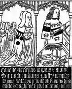Secondly (as her third husband) to Katherine Courtenay (died 1514),[19] a daughter of Sir Philip Courtenay (died 1463)[20] of Powderham, Devon, by his wife Elizabeth Hungerford, daughter of Walter Hungerford, 1st Baron Hungerford (died 1449), and sister of Peter Courtenay (died 1492) Bishop of Exeter and of Sir Philip Courtenay (b.1445) of Molland, MP and Sheriff of Devon in 1471.[21] She requested in her will to be buried in the Greyfriars Church, Exeter "before St Francis beside the High Altar", but was probably buried at Shillingford with her husband.[22] A monumental brass of Huddesfield and his second wife Katherine Courtenay survives in Shillingford St George Church.[23] His sister-in-law Phillipa Courtenay married his step-son Sir Thomas Fulford (died 1489), the eldest son and heir of Sir Baldwin de Fulford (died 1476)[24] by his first wife Jane Bosome[25] By his second wife Katherine Courtenay he had one daughter, according to Pole:[26]