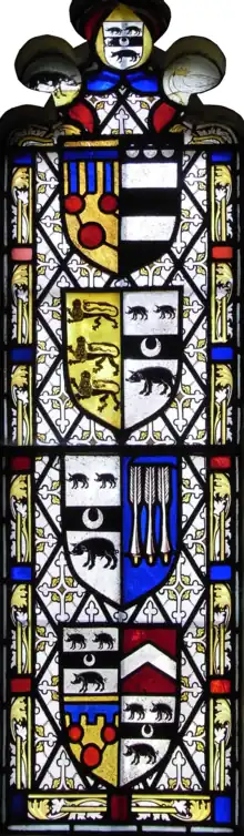 - ↑ Arms: trefoil at top: Left: Courtenay boar, one of the Courtenay supporters; right: Bohun swan, one of the Courtenay supporters; centre: Huddesfield arms. Top shield: Courtenay (Or, three torteaux a label of three points azure) impaling Hungerford (Sable, two bars argent in chief three plates), representing the marriage of the parents of Katherine Courtenay, wife of Sir William Huddesfield. 2nd shield down: Carew (Or, three lions passant guardant in pale sable) impaling Huddesfield, representing the marriage of Sir Edmund Carew and Katherine Huddesfield, daughter of Sir William Huddesfield. 3rd shield down: Huddesfield impaling Bosum (Azure, three bird-bolts argent[8]), representing Sir William Huddesfield's first marriage to Jennet or Elizabeth Bosum. Bottom shield: Quarterly 1st & 4th: Huddesfield; 2nd: Fulford (Gules, a chevron argent); 3rd: Courtenay. (incorrect heraldic usage, quartering should only show arms of heiresses)
