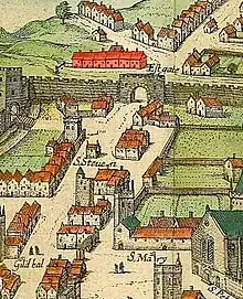 Hurst's Almshouses, highlighted in red, painted by Braun and Hogenburg, outside the East Gate of the city