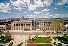 Built in 1999, the annex is a four-story, steel-reinforced masonry building with a facade clad in limestone to match the historic courthouse building. Designed by the architecture and planning firm, Bohlin Cywinski Jackson in conjunction with hemmler + camayd architects, the annex fronts on Washington Avenue. Although its restrained design features no overt references to the classical detailing of the 1931 building, its materials and proportions are similar. The facade is divided into upper and lower halves, but in lieu of a colonnade, the upper half is embellished by a row of large, deeply set windows.[1]