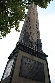 In 1878 he earned the thanks of the nation on different grounds, by defraying the expense of bringing the Egyptian obelisk called Cleopatra's Needle from Alexandria to London, where it was erected on the Thames Embankment. The British Government had not thought it worth the expense of transportation.[1] This is now one of London's best known landmarks. Erasmus Wilson was also closely associated with the Royal Medical Benevolent College in Epsom, Surrey, now Epsom College. One of the boarding houses 'Wilson House' established in 1873 is named after him and carries his name on the foundation stone located to the north east corner of the building, right of the entrance.