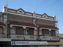 The two westerly shops are a matching pair of two-storey, gabled roofed brick shops, the details above the cantilevered awning being relatively intact, with cantilevered wooden balconies decorated with cast ion posts and balustrades and curved corrugated iron roofs. The walls are decorated with polychrome and projecting brickwork and classical mouldings in cement render and have small central triangular pediments. The shop front at ground level has been substantially altered with a large glass display window dominating the entrance at Action Realty and the printers shop next door.[1]