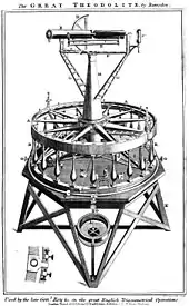The main survey instrument from 1802 for the primary triangles was a Great Theodolite made by William Cary. This was very similar to the instruments used in France and Britain for previous trigonometrical surveys. It had a horizontal circle that was 36 inches (91 cm) and the readings were taken using a microscope. The vertical graduated circle was 18 inches (46 cm) in diameter.[9] It weighed about half a ton and needed twelve men to carry it. Lambton measured all three angles of triangles in several cases to establish the spherical excess (angles of triangles on a sphere sum up greater than 180°). When the survey was carried out from Madras to Bangalore, Lambton was able to compare the Bangalore baseline of 1804 with the calculated measurements and the difference was about 3.5 inches (8.9 cm).[14]