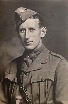 Wallace, who was a cadet of the Officers Training Corps, was commissioned second lieutenant in the 5th Battalion, The Rifle Brigade (Prince Consort's Own) on 5 August 1914, while still an undergraduate.[13][14][15][16] There were suggestions at the time that he was the first undergraduate to go into action but they were not substantiated.[3] After two weeks' training at Sheppey, he departed for France on 30 August. There, he participated in the First Battle of the Aisne and was active on the Western Front at Frelinghien and Ploegsteert Wood.[3]