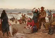 Wyllie was known for his paintings of maritime and coastal scenes, in both watercolors and oils. His maritime scenes capture coastal living of the French and British in the nineteenth century. Wyllie depicted various types of trading sailboats, along with fishermen and women working along the shore-side, revealing the "labourous fishing industry" and highlighting the workers daily struggles.[8] Other paintings capture traders in past French marketplaces, and The Soldier's Farewell from 1871, captures a young man leaving home to go to war (likely the Franco-Prussian War).[9]