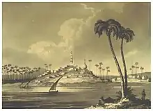 Meanwhile, in Alexandria, another detachment of the army, rather stronger, was then sent to renew the attempt; the force was ordered to proceed with a strong force of artillery, to destroy the town with "shot and shell".[12] It was not Nicholas's turn to accompany this party, but he specially applied to be sent, on the ground of knowing the place, and so was permitted to go.[9] He writes, "We made batteries innumerable; but the difficulty of bringing shot and shells from Alexandria prevented our keeping up so hot a fire as we could wish. We continued in this position before the town from March 22nd to April 21st, the Turks making sorties and annoying us with shot and shell daily during the whole time."[12] Much of the British infantry was cut to pieces by the Turkish cavalry, and the force again withdrew to Alexandria in defeat.[13]