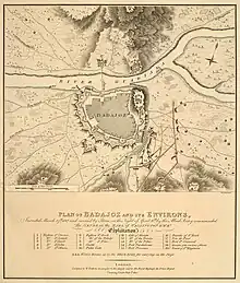 On 13 February 1812, Nicholas left Cadiz for Elvas, and took part in the third and last Siege of Badajoz. On the night before the siege of 6 April 1812, having volunteered to reconnoitre, he stripped, and crossed the artificial lake to the east of Badajoz, known as the inundation,[23] and ascertained the safest passage for the column. To him was confided the task of leading the troops of the advance to the great breach.[24] Nicholas and Lieutenant Emmett worked to lead men of the 4th Division into the Santa Maria breach amid the chaos and confusion,[24] and Nicholas was observed by Lieutenant Shaw, of the 43rd, making incredible efforts to force his way with few men into the Santa Maria bastion.[25] He led at least two rushes with small numbers of men, trying to reach the top, but was each time repulsed.[24] He was wounded at least four times: by a musket-ball in his knee-pan, and by a bayonet thrust in the great muscle of his right leg; his left arm was broken and his wrist wounded by a musket-shot.[26] Then, on seeing Lieutenant-colonel Macleod and Captain James fall,[27] and hearing the soldiers ask who was to lead them,[7] he led a third onset with some seventy men,[24] ordering two of them to carry him up the breach. One of his supporters was killed at the top, and Nicholas was shot through the chest, the musket-ball breaking two ribs. This shock propelled him from the top to the bottom of the breach.[7]