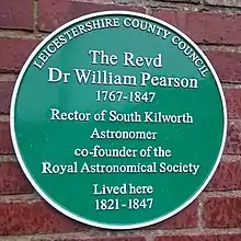 On 16 January, 2020, a green plaque was unveiled at the Rectory, South Kilworth, Leicestershire.[13] William Pearson lived there from 1821 until his death in 1847.