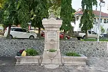 The granite fountain is divided into a centre part with memorial inscription, gargoyles and two flanking fountain troughs. The memorial inscription reads: