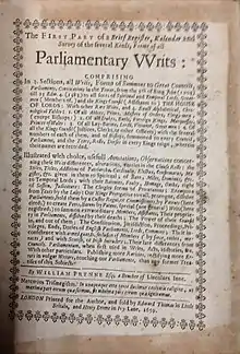 - ↑ William Prynne (1659). The first part of a brief register, kalendar and survey of the several kinds, forms of all parliamentary vvrits: comprising in 3. sections, all writs, forms of summons to great councils, parliaments, convocations in the Tower, from the 5th of King John (1203) till 23 Edw 4. (1483) to all sorts of spiritual and temporal Lords, greatmen (members of,) and the Kings council (assistants to) the House of Lords: with other rare writs, and 4. exact alphabetical, chronological tables: 1. Of all abbots, priors, masters of orders, clergy-men, (except bishops:) 2. Of all dukes, earls, forreign kings, marquesses, princes of Wales: 3. Of all lay-barons, lords, vicounts, great men: 4. Of all the Kings council (justices, clerks, or other officers) with the several numbers of each of them, and of bishops, summoned to every council, parliament, and the years, rolls, dorses in every kings reign, wherein their names are recorded. Illustrated with choice, usefull annotations, observations concerning these writs differences, alterations, entries in the clause rolls: the stiles, titles, additions of patriarcha, cardinalis, electus, confirmatus, magister, &c given in them to spiritual; ... With other particulars. Publishing more rarities, rectifying more errors in vulgar writers, touching our parliaments, than any former treatises of this subject. By William Prynne Esq; a bencher of Lincolnes Inne (1st ed.). London: Printed for the author, and sold by Edward Thomas in Little Britain, and Henry Brome in Ivy-Lane. OCLC 83751432.