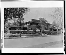 The house is built in dark red brick, possibly the same batch that was used for the Larkin Administration Building.[11] The ground floor is reminiscent of the Isidore H. Heller House,[9] and the house is also considered similar to the Meyer May House.[12] The Heath House is distinctive due to the house being designed to compensate for the narrow lot. It is considered a precursor to Wright's renowned Frederick C. Robie House built in Chicago in 1909,[9] constructed on a similarly sized block of land.