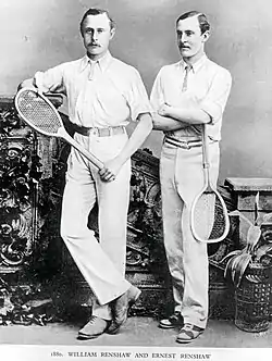 Renshaw won a total of twelve Wimbledon titles.[4] His record of seven singles titles, which Pete Sampras tied in 2000, was surpassed in 2017 when Roger Federer won his eighth title. The first six were consecutive, an achievement which has been unequalled to this day.[5] Since 1922 the reigning champions have had to play in the main draw, making such feats considerably more difficult. In the summer months he would compete in England and Ireland, while competing on the French Riviera during the winter months and practising on a private tennis court he and his brother had built at their own cost.[6] In singles play he played his twin brother Ernest Renshaw three times (1882, 1883 and 1889) in the Wimbledon final, triumphing on all three occasions. He was unable to defend his title in 1887 because of tennis elbow, the first time this injury received public attention, and during his absence took up golf.[6][7][8] The other five titles were in the Gentlemen's doubles, partnering with Ernest. Additionally, he and his brother dominated the sport for many years in a time when the only other Grand Slam was the U.S. Championships, and by custom players did not travel far. The rise in popularity of tennis in this period became known as the 'Renshaw Rush'.[9][10] In 1888 William was elected the first president of the British Lawn Tennis Association (LTA).[6] In 1983, William Renshaw was elected posthumously into the International Tennis Hall of Fame together with his brother.[2]
