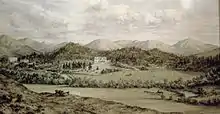He and his family moved from Adelaide to New Zealand, arriving in Nelson on 1 May 1856[1] and initially resided in Nelson.[2][9] On 5 May Robinson deposited £10,000 with the Nelson commissioner of Crown lands. He sought right of choice, under Governor George Grey's 1853 regulations, over 40,000 acres of 5s. land. While Robinson’s claim was not legal, the acceptance of his deposit by validated it, despite the regulations expiring the next month, without full payment. This allowed Robinson to obtain claim title to the flats and best portions of the massive Cheviot Hills from under the nose of the existing crown lease holder, John Scott Caverhill (1820–1897).[10][11] Caverhill then made the best terms he could, and exchanged his lease of Cheviot with Robinson in return for the lease of the Hawkswood run which Robinson purchased for him.[1] Between 1857 and 1862 Robinson was able to freehold the entire Cheviot Hills run for a total of £31,455. William James Gardner, in his book A Pastoral Kingdom Divided, said that this "was probably the largest and most spectacular transaction of the kind ever undertaken in New Zealand".[12] It was the purchase of Cheviot Hills and his paying for it in cash, which gave him the sobriquet of "Ready Money Robinson."[2] The land, which extended from the Hurunui River in the south, the Waiau Uwha River in the north, the Lowry Peaks range to the west and the Pacific Ocean coastline to the east,[12] amounted to 84,248 acres (34,094 ha).[2] Only the Glenmark station of George Henry Moore was more valuable.[1]