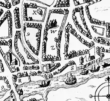 During this period he cooperated with various other merchants,[29] of whom the most prominent was Henry Tooley, founder of the town's almshouses in Foundation Street.[30] Upon the suppression of the Ipswich Blackfriars monastery in 1538, the site and conventual buildings were at first leased to Sabyn (who had premises adjacent), and were finally sold to him in November 1541, to hold in chief for the twentieth part of a Knight's fee.[31] In his will written in 1542 he refers to them as "my house and mansion place late called the blak ffreres in Ippiswiche"; the will also shows that he owned various premises and tenantries in the town, and in Mendlesham and Stowmarket, and also two tenements in the University of Cambridge opening against the Cambridge market, one occupied by Master Hacher and one by Mistress Cheeke. His ship, the James of Ipswich, was to be kept working after his death until it was sold.[32] His tenures of various quays in the neighbourhood of St Mary Key are listed in a Rental of 1542.[33]