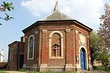 - Moulton Chapel, St James Moulton. The original church is brick and octagonal in form. Each side of the octagon has a pair of giant pilasters of the Doric order, similar to the pilasters on the façade of Fydell House. The doorway and widows are arched and the interior has a domed roof. A baroque date inscription is present. The Spalding Gentlemen's Society has a drawing by John Talman showing that the architect had originally intended to surmount the building with a cupola.[5] It can be compared with the less ornate octagon Preskbyterian and later Unitarian Octagon Chapel of 1756 in Norwich, which is thought to have been inspired by the architecture of the Low Countries.[6]