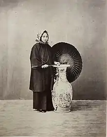 Saunders was born in Britain in 1832, and first travelled to China in 1860 as an engineer.[4] He then returned to Britain, studied photography, and returned again to China with photographic equipment, where he opened one of Shanghai's first photography studios in January 1862.[3] Located near the famous Astor House Hotel at the centre of Shanghai's commercial hub, Saunders' studio became the city's leading photographic studio.[5] Saunders' studio was to remain open for twenty-five years, a testament to his "considerable photographic talent [combined] with business acumen and marketing flair."[6] Although chiefly a portrait photographer, Saunders' fascination with China led him to photograph current events, local scenery and the local population.[7]