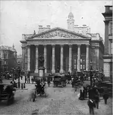 The rebuilding of the Royal Exchange, opened in 1844, was Tite's greatest undertaking.[3] The previous building was destroyed by fire in 1838, and a competition to design a replacement was held the following year. When this proved unproductive, a second limited competition was held between Tite, Charles Robert Cockerell, George Gwilt, Charles Barry and Robert Smirke. Tite's winning design has an imposing eight-column entrance portico, inspired by the Pantheon in Rome, while the other sides of the building are based on Italian renaissance models.[5]