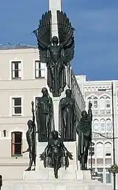 After the war, many ideas for a war memorial were put forward. Gould proposed a column opposite the ChristChurch Cathedral and by 1920, this was one of the three dominant proposals. Two of those proposals, the other the Bridge of Remembrance, were eventually adopted, with Gould's idea receiving the support of the Canterbury Anglican elite. While the Bridge of Remembrance was unveiled in 1924, the Christchurch City Council opposed the Cathedral Square proposal and stopped it from going ahead. The argument was that the cathedral would dwarf the memorial, and that the bustling nature of the Square was an inappropriate setting for a place of reflection.[2] In 1933, the Godley Statue was relocated from its position just north of the cathedral to its original location opposite it. Gould seized the opportunity and proposed the vacated site for the memorial, and the Anglican Church as the owner of the land agreed under the condition that a cross be incorporated into the design. Gould promoted the memorial as "an emblem of peace rather than ... war". The manufacturers' association wanted the work to be done locally and put Trethewey's name forward, but the Returned Services' Association opposed this as he had not served in the military during the war.[3]