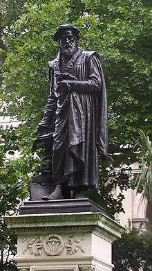He was found guilty by his own admission and condemned to be executed. Tyndale "was strangled to death[44]:220 while tied at the stake, and then his dead body was burned".[45] His final words, spoken "at the stake with a fervent zeal, and a loud voice", were reported later as "Lord! Open the King of England's eyes."[46][47] The traditional date of commemoration is 6 October, but records of Tyndale's imprisonment suggest that the actual date of his execution might have been some weeks earlier.[48] Foxe gives 6 October as the date of commemoration (left-hand date column), but gives no date of death (right-hand date column).[39] Biographer David Daniell states his date of death only as "one of the first days of October 1536".[47]