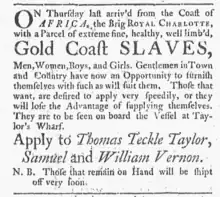 One of the more famous vessels of the Vernons was the brig Royal Charlotte. The Royal Charlotte was used in at least two slave voyages to West Africa. Once in 1762, and again in 1767. A report from the Newport Mercury on June 6, 1763, reveals an uprising of enslaved people that happened aboard the 1762 voyage. Following this uprising, Captain Taylor brought the remaining enslaved African peoples to Rhode Island for sale. An advertisement for the cargo describes them as a "Parcel of extreme fine, healthy and well limbed Gold Coast Slaves; Men, Women, Boys and Girls." Clients were encourage to view the cargo on the Royal Charlotte, docked at Taylor's Wharf.[9]