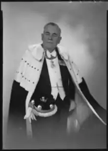 Lord Armstrong in June 1953, wearing his coronation robe.
