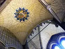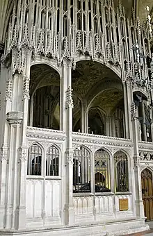It is certain that Waynflete took an active part in the restoration of Eton College. Edward had annexed it to St George's, Windsor in 1463, depriving it of a large part of its possessions. In the earliest Audit Rolls after the restoration of the college in 1467 there are many entries of visits of Provost Westbury to the lord of Winchester, which in January 1468–69 were for beginning the work of the church and providing money for them. Why a pardon was granted to Waynflete on 1 February 1469 does not appear.[27] On the restoration of Henry VI on 5 October 1470 Waynflete welcomed him on his release from the Tower of London. This necessitated a new pardon, granted a month after Edward's reinstatement on 30 May 1471, and a loan to the king of 2000 marks (£1333 6s 8d).[28] In the years 1471–1472 to 1474 Waynflete was largely engaged in completing the church, now called the chapel, at Eton: his glazier supplied the windows, and he contracted on 15 August 1475 for the rood-loft to be made on one side "like to the rode bite" in Bishop Wykeham's college at Winchester, and on the other like that of the college of St Thomas of Acre in London. In 1479 he built the ante-chapel at the west end of the chapel, of Headington stone.[16]