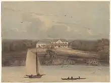 The arrival of Investigator at the settlement at Port Jackson (now Sydney) on 8 May 1802 seems to have revitalised Westall. During there ten-week hiatus there, he produced a great deal of work, including no fewer than thirteen detailed drawings of the Hawkesbury River, with which he was much taken. He also sketched some local Aborigines, and was commissioned by the Governor, Phillip Gidley King, to paint Government House. The resulting watercolour is one of a very few paintings that Westall completed during the voyage.[13]