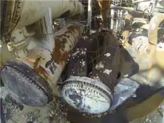 ![]() Post-blast photograph of the heat exchanger which ruptured catastrophically, causing extensive explosion and fire damage to the plant. | |