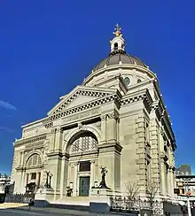 Above the arched openings on both sections is a low attic clad with stone. An ornate cornice runs above the attic.[7] Near the top of the building is a drum with 20 oval windows.[17] The drum supports a large cast-iron dome.[7][8] The dome is covered in steel plates, which the New-York Tribune described as being "laid in the same manner as slates"; this gave the dome a silvery effect.[11] The top of the dome has a cupola with a weather vane.[7] In a book about the building, the Williamsburgh Savings Bank described the dome as "comparing favorably with those of the capitol dome at Washington, with St. Paul's in London and St. Peter's in Rome".[18] The dome became a symbol of the bank, leading bank officials to request the inclusion of a dome atop its second headquarters at One Hanson Place (built in 1929), over the objections of that building's architects Halsey, McCormack and Helmer.[19]