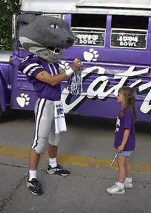 Willie is known to be tough but also mischievous. He is K-State's #1 fan. The student inside the mascot costume (whose identity is kept secret) changes every few years, and the persona of Willie has remained the same throughout.[6] Willie has been known to crowd surf and he also does one push-up for each point on the board for K-State when the Wildcats score a touchdown or make a field goal at football games. He also leads crowds in his signature K-S-U chant in which he moves his arms in legs to form a 'K'-'S'-'U' then fist pumps to signal the crowd to yell "WILDCATS" 3 times in a row. Willie also signs various objects using his iconic signature, signing his name "Willie Wildcat" in which a paw print is drawn and used in place of the "W" in both words.