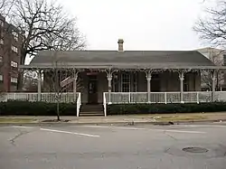 The first railroad depot in Wilmette was built in 1870–71 for $700 by a group of landowners hoping to develop the area. As well as being used as a railroad depot, this original depot was used for local elections, including the referendum on the incorporation of Wilmette in 1872. This depot burned down, and residents built the Chicago and Northwestern Depot in 1873. The depot was built to be fireproof and cost $3,400, which was donated by ten residents.[1] The depot was designed in the Italianate style and was a brick building with a gabled roof and columns in front.[2] In the 1890s, Wilmette's growing number of commuters wanted a new depot to be built on the inbound side of the tracks. The Chicago and Northwestern Depot was moved one block north from the passenger station and became Wilmette's freight depot. The depot remained a freight depot until 1946, when Wilmette's freight service was transferred to Evanston; the station was then boarded up, and its platform was removed. On June 13, 1974, the station was moved away from the railroad tracks to its current site to avoid demolition. The depot was added to the National Register of Historic Places in 1975. A cable television company leased the station for several years after its relocation. The building was leased to a different family and converted into a restaurant called the Old Ouilmette Depot in 1992.[3] The restaurant closed after a 2004 fire, and the building remained vacant until 2008, when a new restaurant called Depot Nuevo opened in the building.[4]