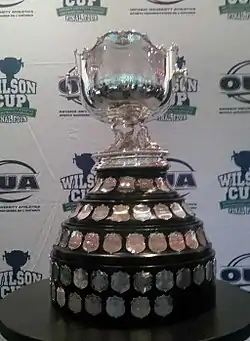 The Wilson Cup was first awarded for the 1908–09 season by Harold Wilson of Toronto.[1] The Cup was originally the championship trophy of the first Canadian Intercollegiate Athletic Union which existed until 1955 and despite its name, was composed only of Ontario and Quebec universities. The Cup was then inherited by the original CIAU's successor, the Ontario-Quebec Athletic Association which eventually became the OUA. Since the 1962–63 season the Wilson Cup winner has gone on to compete for the national championship W. P. McGee Trophy. The 2021 championship was cancelled due to the COVID-19 pandemic in Canada.[2]