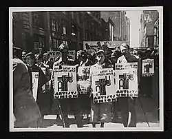 ![]() Union members rally for awareness. From left to right: Edward "Deyo" Jacobs, Winifred Milius, and Hugh Miller. Photograph by Irving Marantz. From the Archives of American Art | |