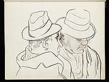 Elsa Simonson died in 1933, which led Milius to become more serious about her artistic career. In October 1933 she enrolled in the National Academy of Design to learn figure drawing. Eventually she became frustrated by the strict and conservative nature of the academy. After an instructor told her to concentrate on plaster casts to bring "classic dignity" to her life drawings, she quit school and declared she was going to move out of New York. Instead of leaving, she took classes at the Art Students League of New York, where students could choose their own classes without strict guidelines. In 1934 she began taking a life drawing class under artist George Grosz. An opportunity to study under Grosz appealed to her due to his leftist ideologies and technical innovations.[1] Despite disappointment in Grosz's political weariness, Milius found influence in Grosz's class trips to the Hooverville shantytowns,[1] where Milius and her classmates documented the plight of the homeless during the Great Depression. The victims and impoverished that she observed would find their way into sketches, which eventually developed into prints.[1][3]