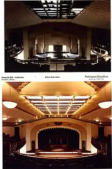 The Hall was threatened with demolition in the 1960s when the County Board proposed to demolish the hall in favor of building a parking ramp in order to extend the parking lot located next to it. The Hall's future was assured when, in 1974, the building was named an Illinois Historical Landmark. In 1976, Memorial Hall was placed on the National Register of Historic Places in time for the United States Bicentennial. In 1978, a federal grant matched $25,000 in renovation funds for work on the heating, wiring and insulation. However, by the late 1980's, the building had deteriorated so much that it needed major renovations, repairs and modernization. A County Board committee, including Rep. Dave Winters and Peggy McGaw (wife of former Mayor Robert McGaw) was formed to develop a plan. Working with the City who provided War Memorial funds which came from the sale of Camp Grant, a four-year $1.5 million restoration project began in 1988.[6]