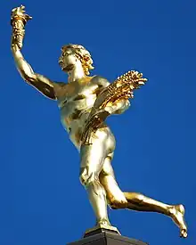 The Manitoba Legislative Building is the meeting place of the Legislative Assembly of Manitoba,[9] in central Winnipeg. It was originally named the Manitoba Parliament Building, not Legislative.[9] The neoclassical building was completed in 1920 and stands seventy-seven meters tall (253 ft).[9] It was designed and built by Frank Worthington Simon (1862–1933)[10] and Henry Boddington III, along with other masons and many skilled craftsmen. The building is famous for the Golden Boy, a gold covered bronze statue based on the style of the Roman god Mercury, or the Greek god Hermes, at the top of the cupola, or domed ceiling.
