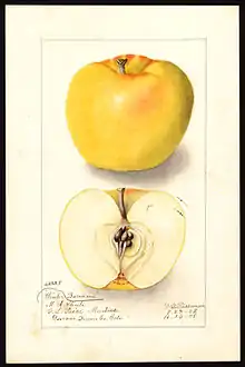 'Winter Banana' is an apple cultivar with high-quality fruit used for fresh eating.[1][2] The fruit is large, with smooth yellow skin that shows bruises more than red apples do. The flesh is rather coarse textured, moderately soft, sweet and aromatic.[1][2] Sugar 12.5%, acid 7g/litre, vitamin C 12mg/100g.[3] Pectine 0.52-0.73%.[4] Typical size height 78 mm, width 74 mm, stalk 16 mm.[5]