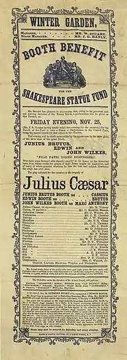 The goal of staging Julius Caesar for just one night was to raise funds for the establishment of a statue of William Shakespeare designed by John Quincy Adams Ward in the relatively new Central Park on the northern outskirts (then) of Manhattan.[22] Tickets went for sale for a (then) astounding price of five dollars. Considering the way history was to unfold, it is curious that it was Edwin Booth who played the role of Brutus, assassin of Julius Caesar, and the role of Marc Antony was played by John Wilkes Booth, while "lean and hungry" Cassius was given to the heavier built Junius Brutus Booth Jr.[23][24]